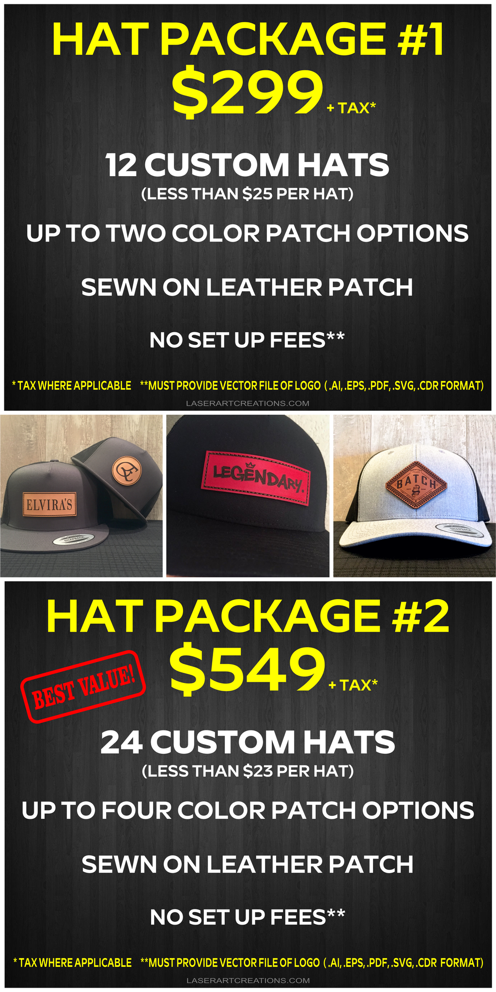 We have spent years perfecting our craft to provide you with the highest quality hats. Our genuine leather patches are laser engraved with your custom logo, professionally sewn (not glued), and are weather resistant. We also offer the most color patch options currently available on the market. Purchasing our hats are a win/win for any business! Customers not only support your brand, but your business receives the free advertising it deserves! Check out our hat packages below. We also offer deeper discounts for high volume orders. Click the "Get Started" button below to reach out to our team.
